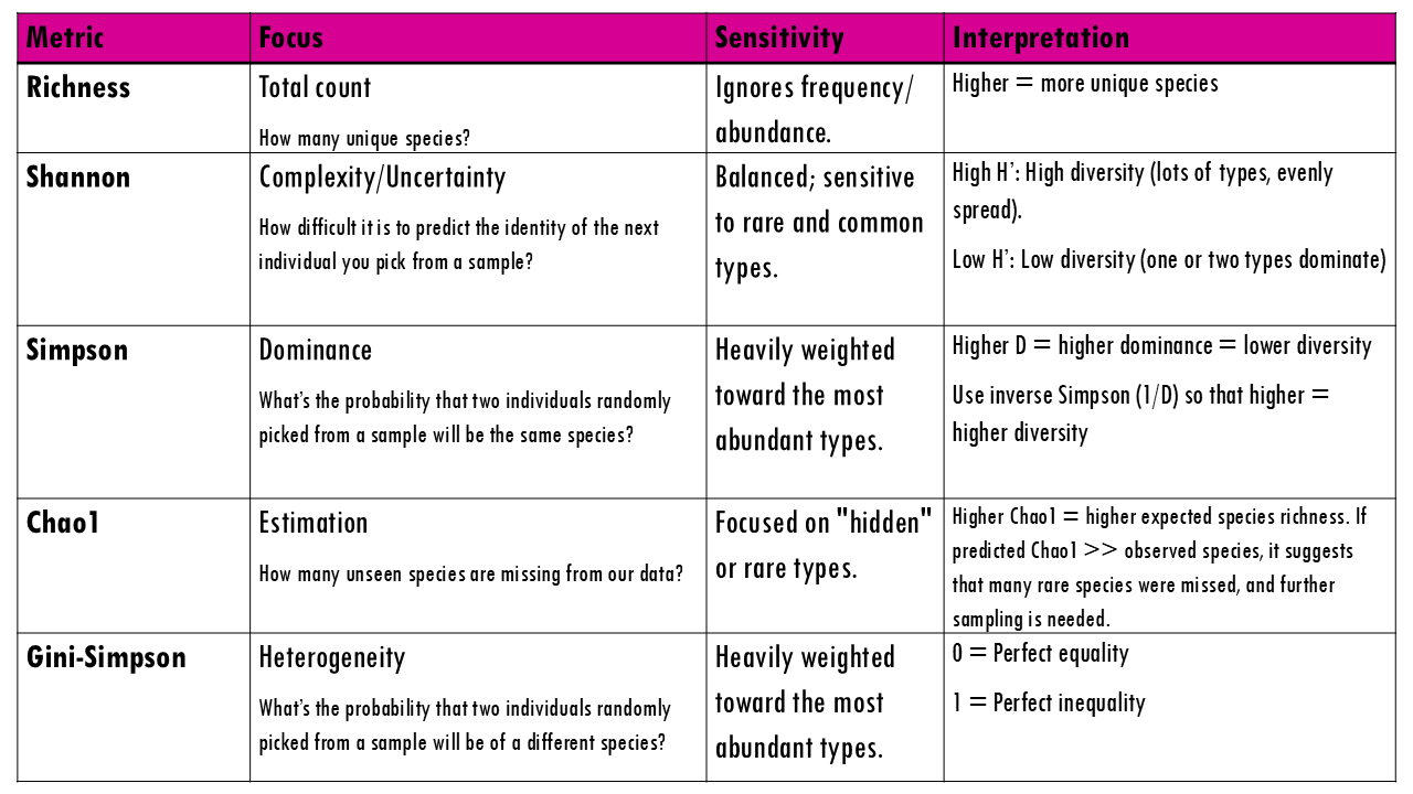 Keep reading or click on the video to learn about alpha diversity metrics, including the Shannon, Simpson, Gini, Chao1 indices and more!