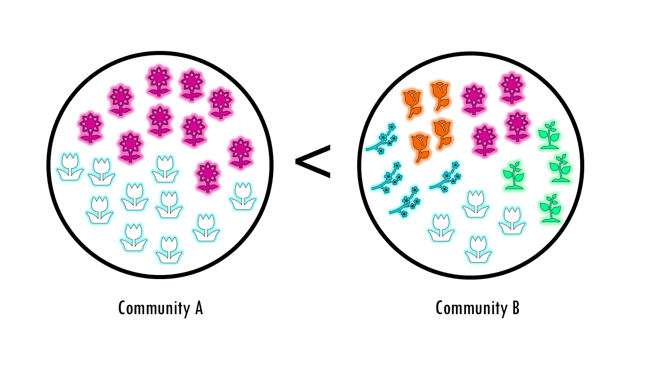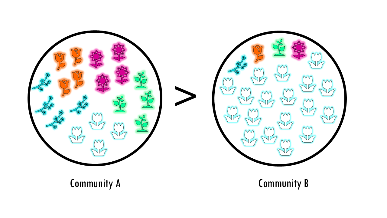 I this example, it’s easy to see that community B is more diverse because it has more variety, a higher number of species.