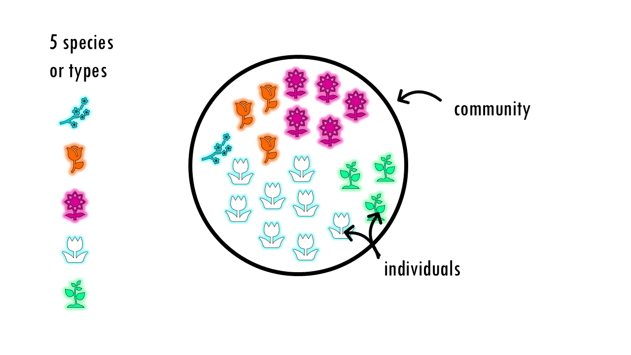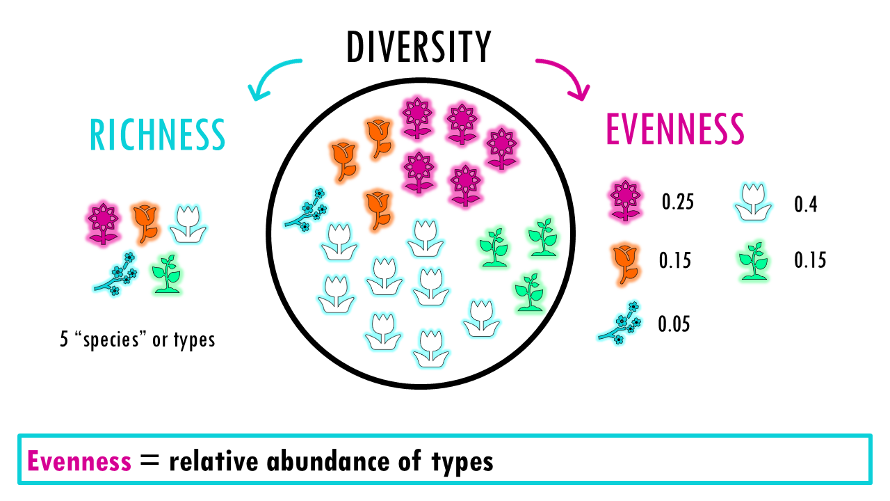 Diversity is a broader concept that combines two ideas: Richness (number of types or species) and Evenness (the relative abundance of those types). A community with evenness of 1 would mean that all its species are present in the same proportion, or equal numbers.