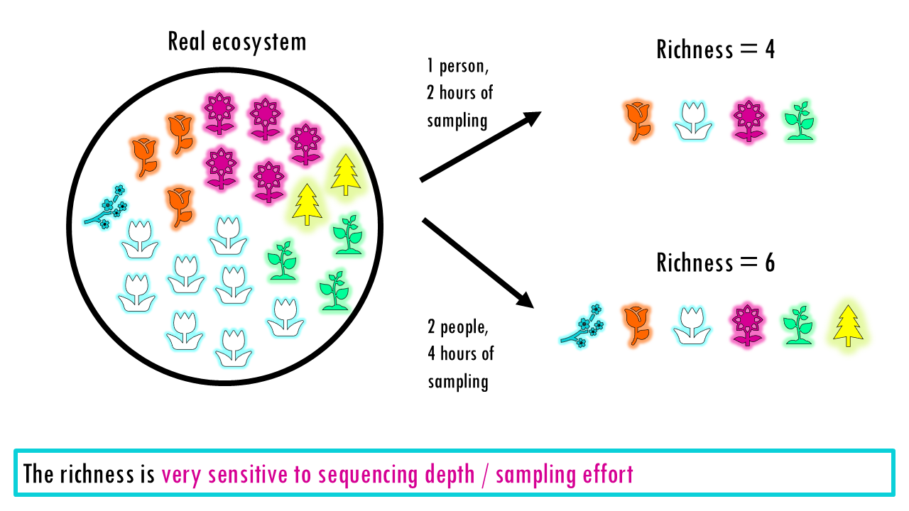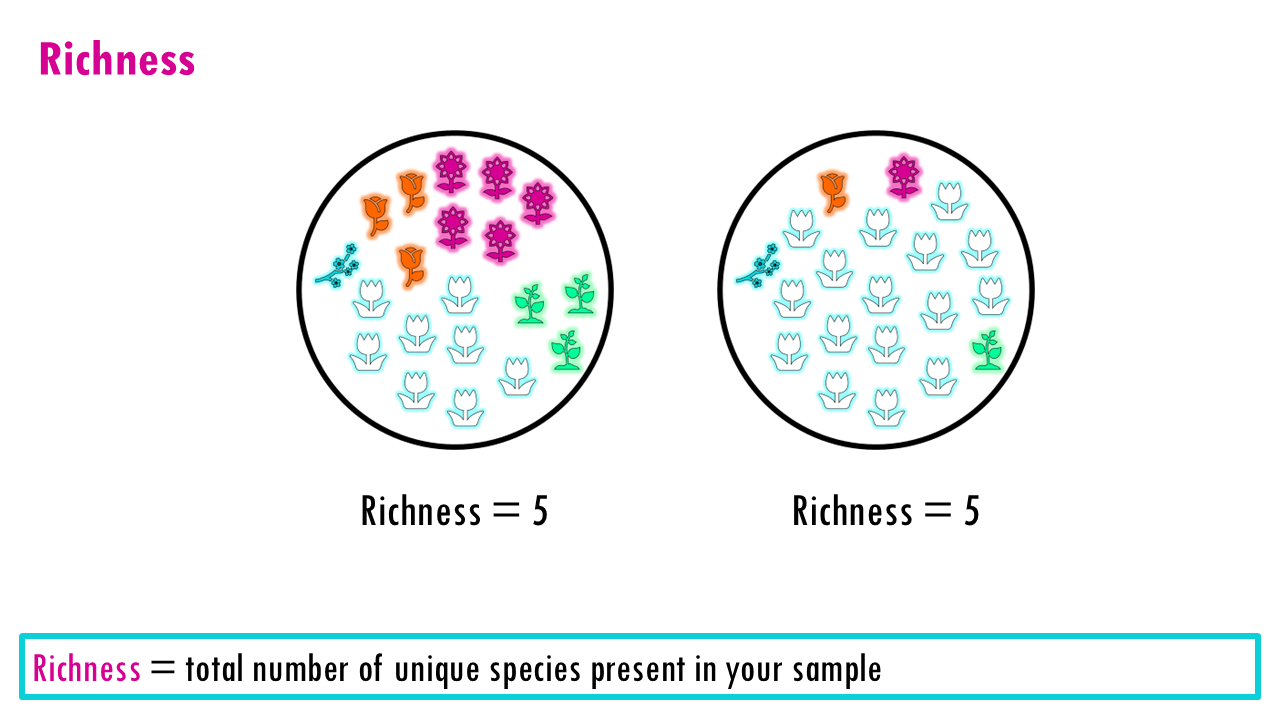 Richness treats every species, or type equally, whether it appears once or 10,000 times. So that is one of it’s main limitations: It doesn’t tell you if the population is balanced. A forest with 100 oaks and 1 maple has the same richness as a forest with 50 oaks and 51 maples, but they “feel” very different. It can also be very sensitive to sequencing depth and technical noise (errors appearing as rare “new” clones), or in the case of ecological studies, how well you did your sampling.
