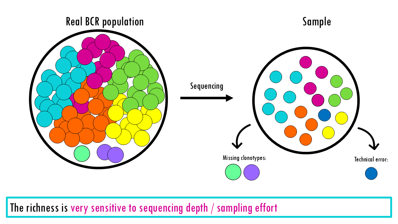 - The richness will count every single clonotype in the samples, even those that only appear once, and as we mentioned, it is more sensitive to sequencing errors and sampling.