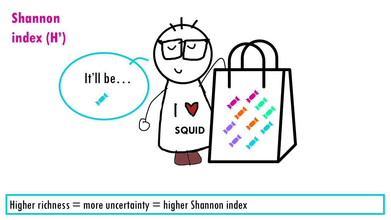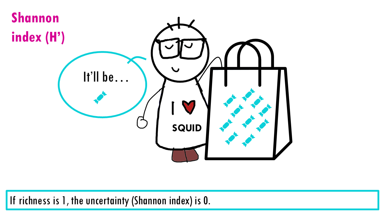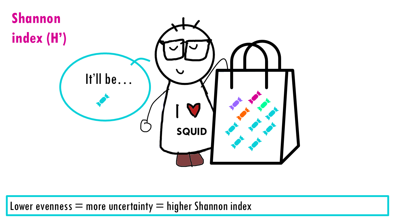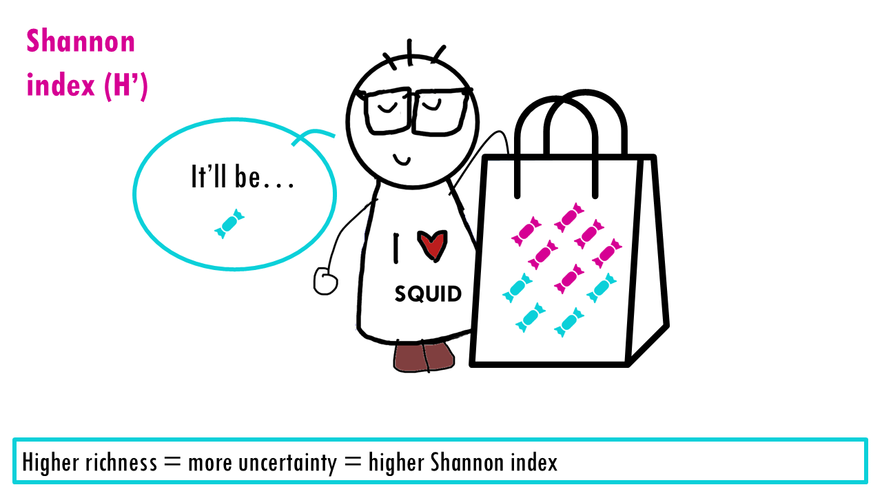 If our community is a bag of sweets, intuitively, the more different colours of sweets there are, the harder it is to predict what you’ll pick out from a bag of sweets. If all sweets are blue, so richness is 1, the uncertainty is zero since we are sure that the randomly chosen sweet will belong to that one only species. If there’s more different colour sweets (more species), we are unlikely to guess which species will be the randomly chosen individual (or sweet). The higher the richness, the higher the uncertainty; so the higher the Shannon index is.