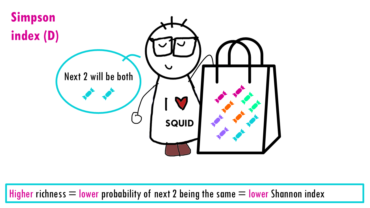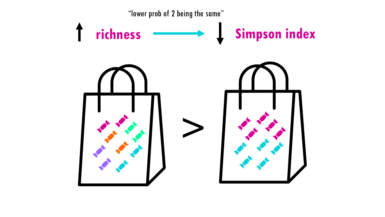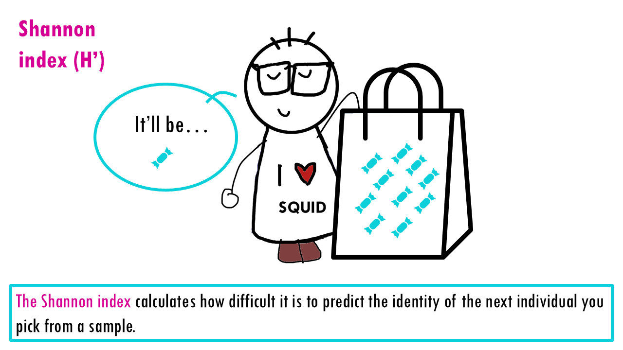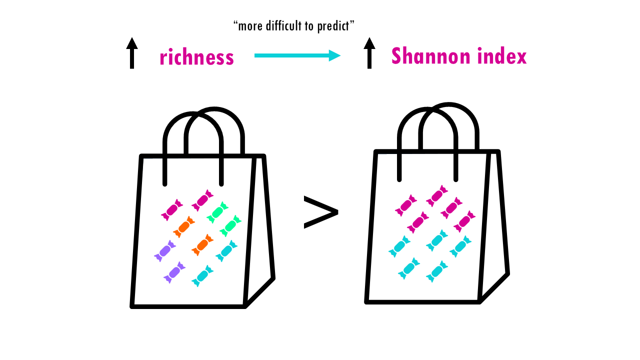 If our community is a bag of sweets, intuitively, the more different colours of sweets there are, the harder it is to predict what you’ll pick out from a bag of sweets. If all sweets are blue, so richness is 1, the uncertainty is zero since we are sure that the randomly chosen sweet will belong to that one only species. If there’s more different colour sweets (more species), we are unlikely to guess which species will be the randomly chosen individual (or sweet). The higher the richness, the higher the uncertainty; so the higher the Shannon index is.