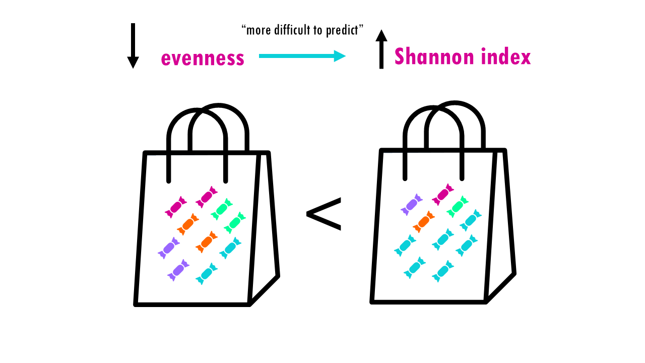 But the Shannon index also depends on the evenness. So if we have the same richness, 4 different species or colours, it’ll be easier to predict if the distribution of abundances is more uneven. Imagine only the blue sweet is very common, then the uncertainty will not be so high since we have a high probability that the randomly selected individual or sweet will be the most abundant species.