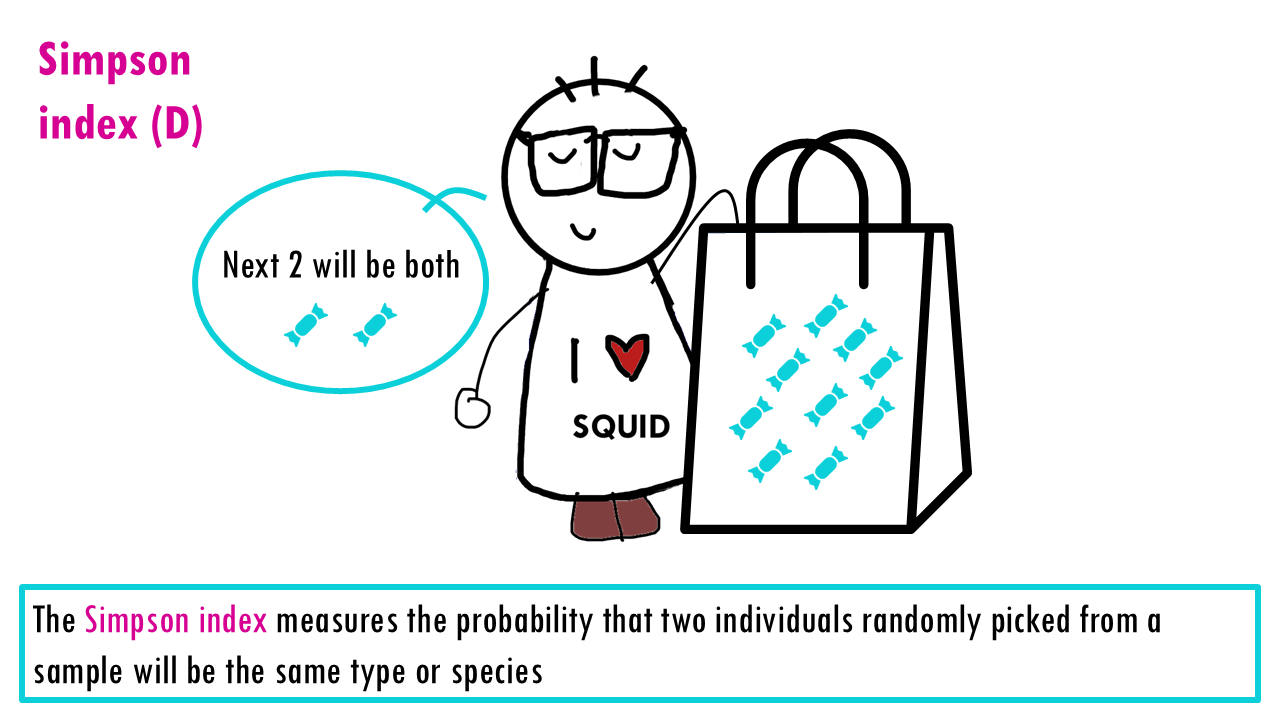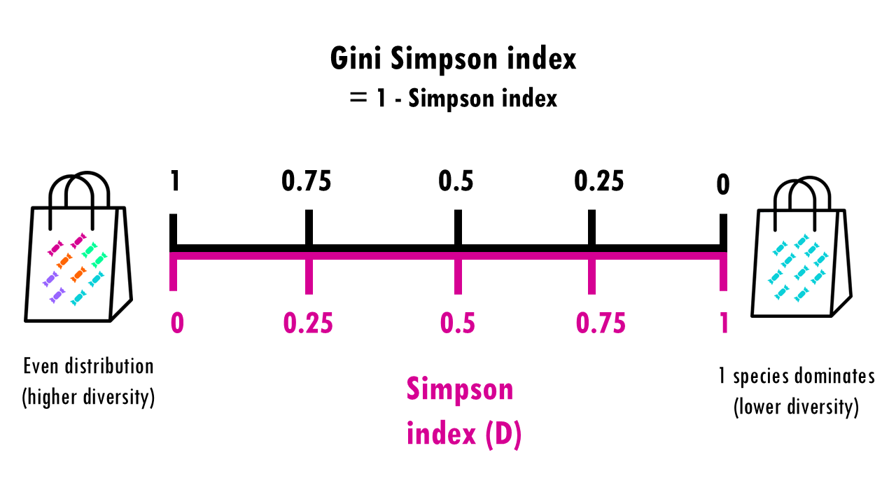 The measures the probability that two individuals randomly picked from a sample will be the same type or species. In other words, it measures dominance, whether a particular species dominates. Since we’re talking about probabilities, the Simpson index goes from 0 to 1, with higher being less diverse. Think about it: if all sweets are the same, then the probability that the two sweets will be the same is 1.