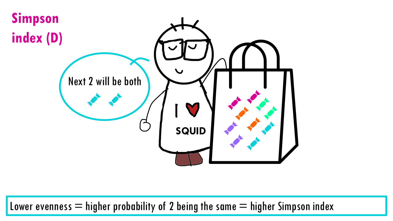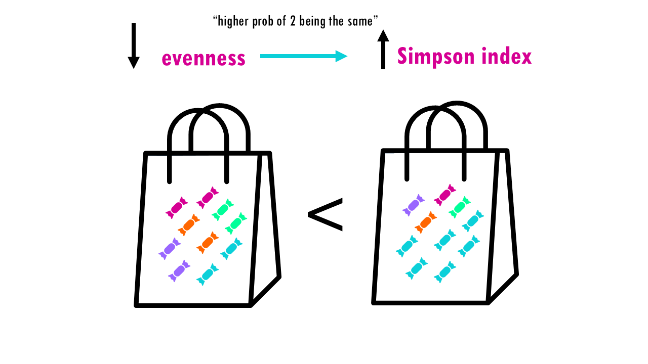Now let’s consider evenness. The lower the evenness – so if 1 sweet “dominates” – then the higher the Simpson index is.