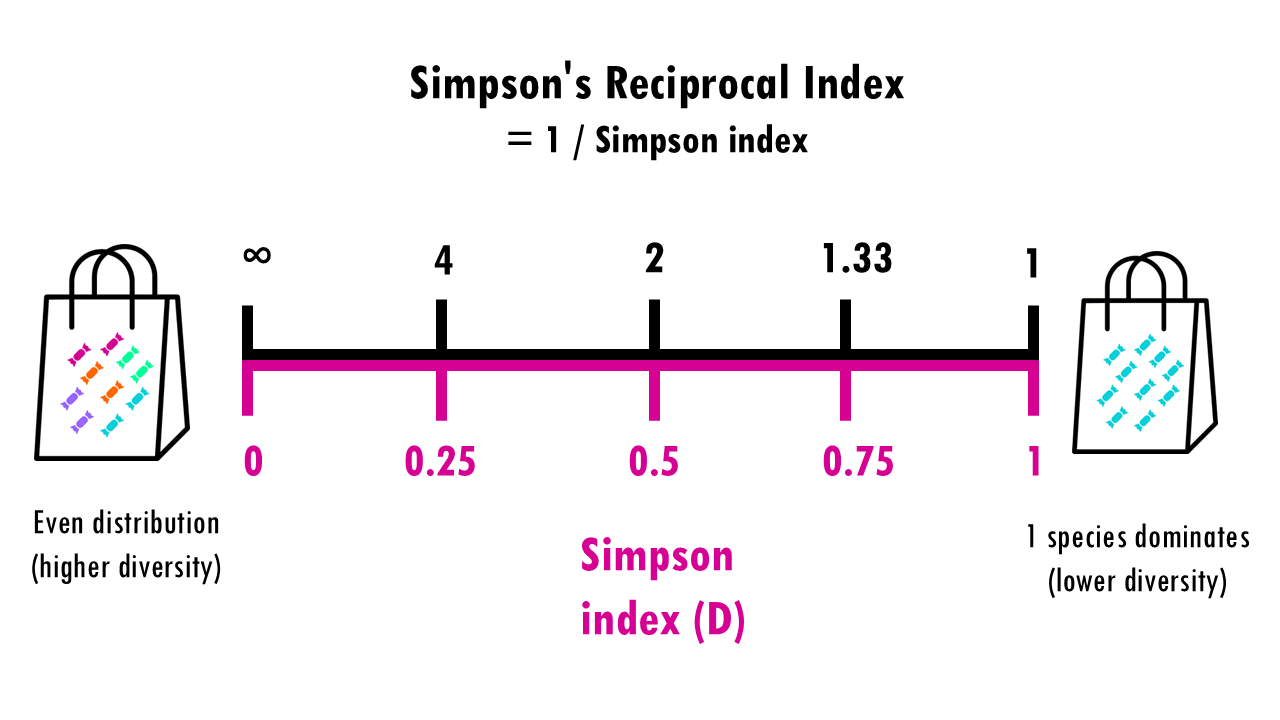 Sometimes you’ll also see Simson’s reciprocal index or inverse Simson which is 1 divided by the Simson index. This just ensures that we can interpret it as the higher the value, the more diversity.