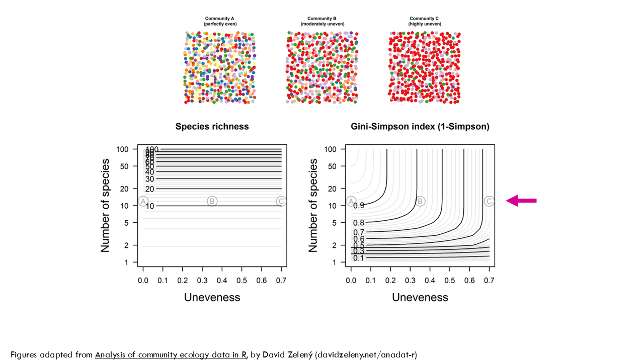 Ok, so like the Shannon index, the Simpson index considers both richness and evenness, but compared to Shannon, it is more influenced by evenness than richness. If we go back to our example, we have 3 communities with the same richness. Let’s have a look at the effect of evenness on the Gini-Simson index. You can see that the less even the community is, so Community C, the lower the Gini-Simpson index (so lower diversity).