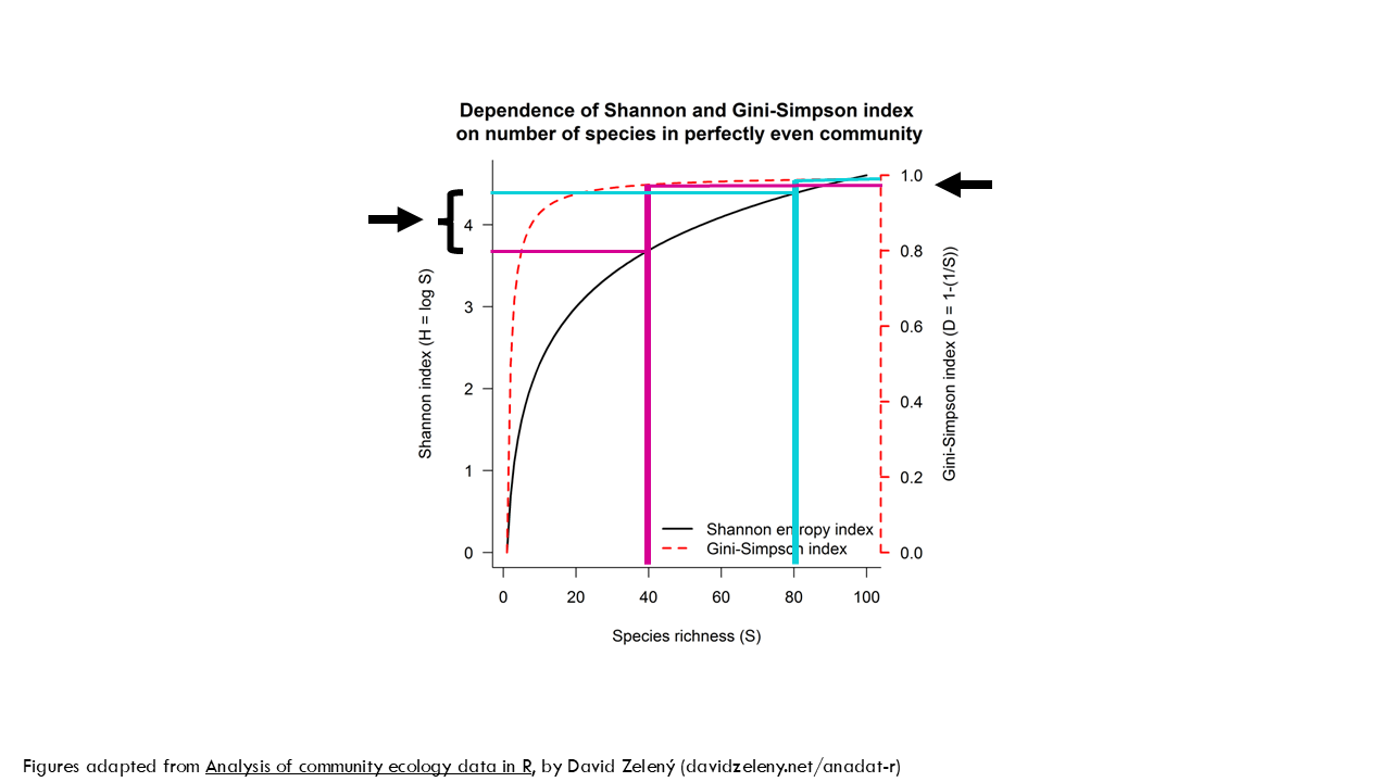 What about the effect of richness? For that we’ll consider perfectly even communities with different number of species. In black we see the Shannon index values, which we already covered. In red we see the Gini Simpson index values which follow the scale on the right. As you can see, the Gini-Simson index values – the red dashed line- quickly increase for the first 10 species or so, but with higher numbers it doesn’t change much. So the difference in the Gini-Simpson index between a community of 40 or 80 species with the same evenness is really small, whereas the Shannon index changes quite a bit.