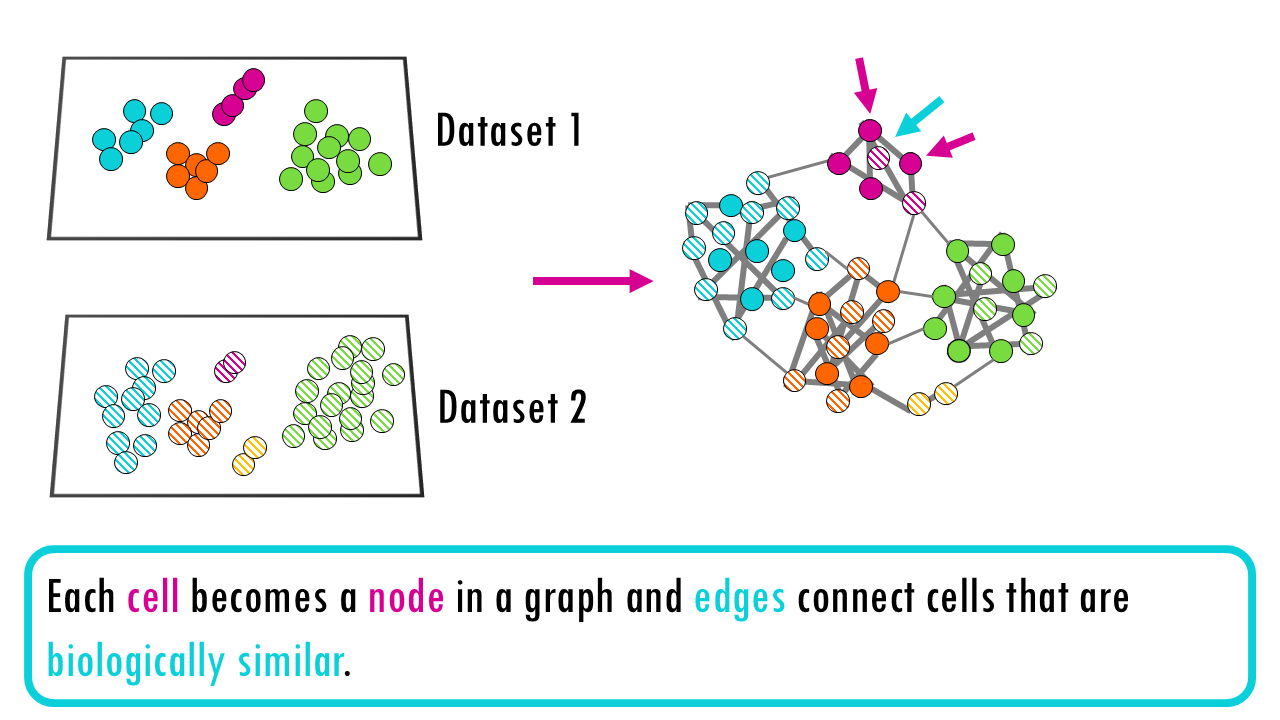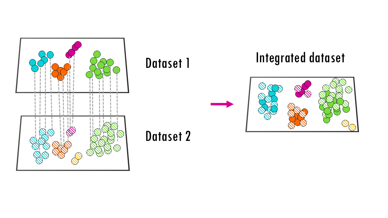 The main strategy of these anchor-based methods is to first identify matching or similar cells across batches, and then align data based on these anchors. For example, if you have two brain datasets from two species, it may find certain cell types (dopaminergic neurons, astrocytes…) that are shared cross-species, and it can use those common cell types to, in a way, “overlap” the two datasets. So the key principle here is to match similar cells first, and then integrate.