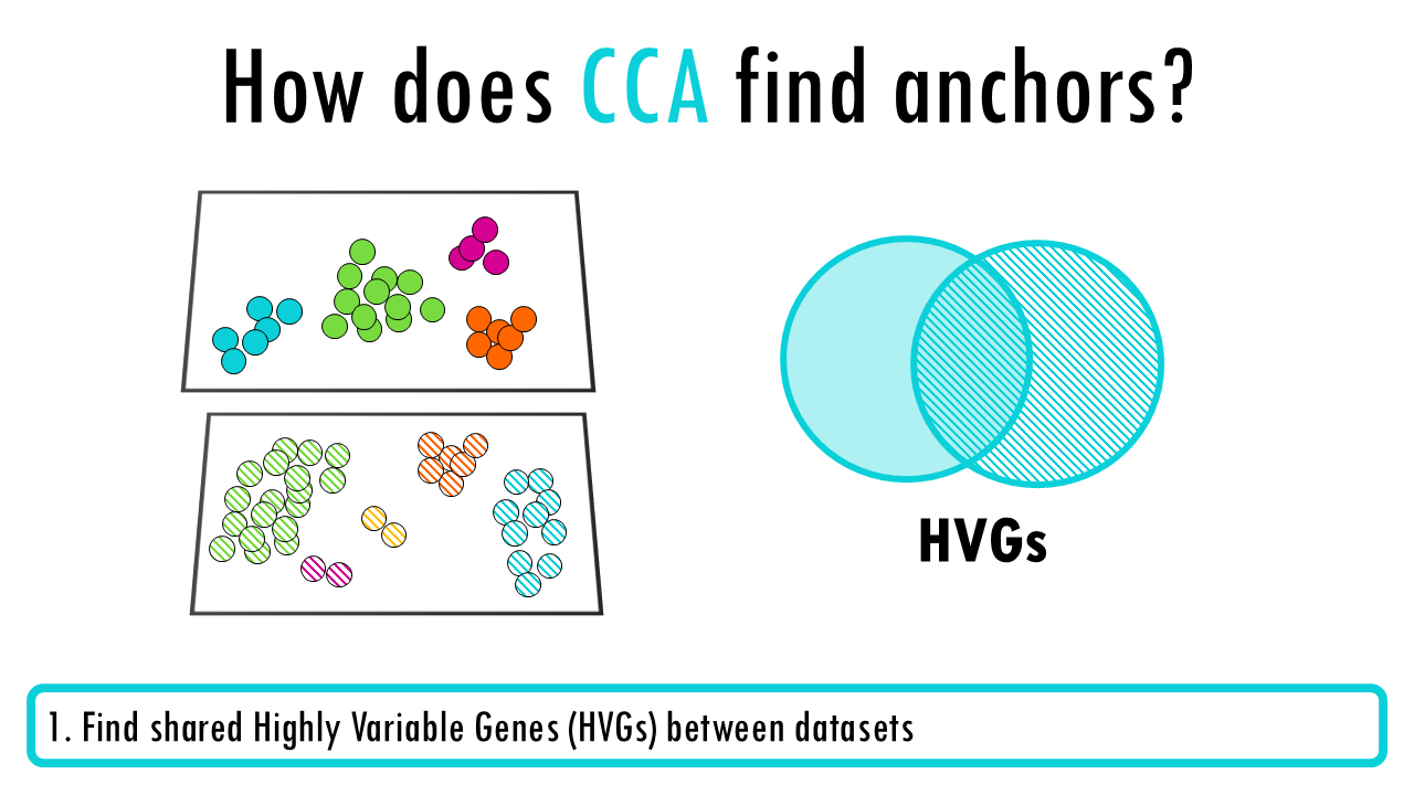 - Perform CCA on the union of HVGs to find maximally correlated projections between datasets