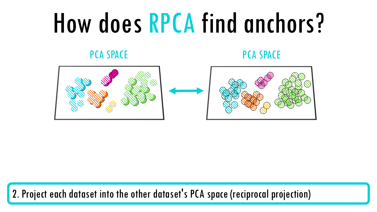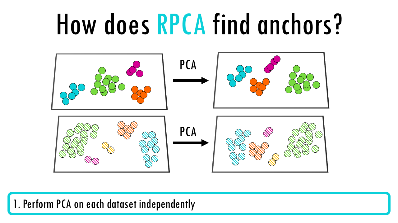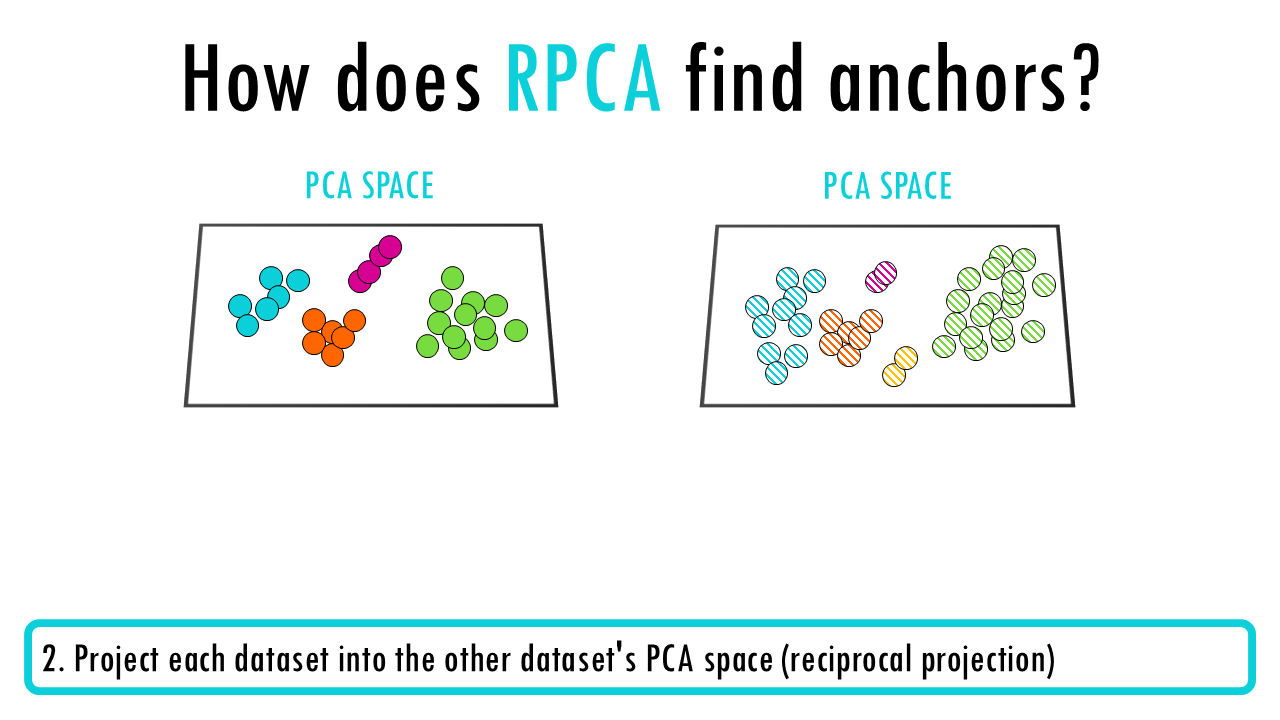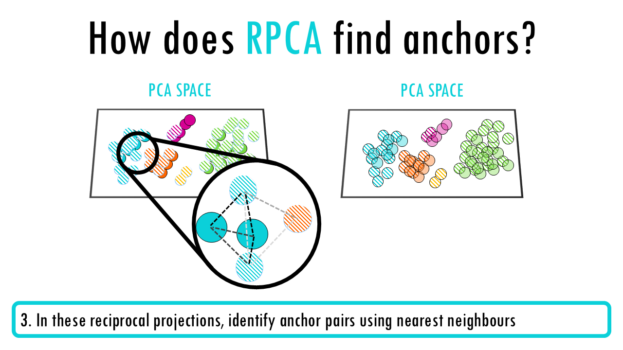 Without going to much into detail, and because Seurat is such a popular package to analyse single-cell data, I’ll briefly mention how CCA and RPCA work. Both use an anchor-based integration strategy with three main steps: