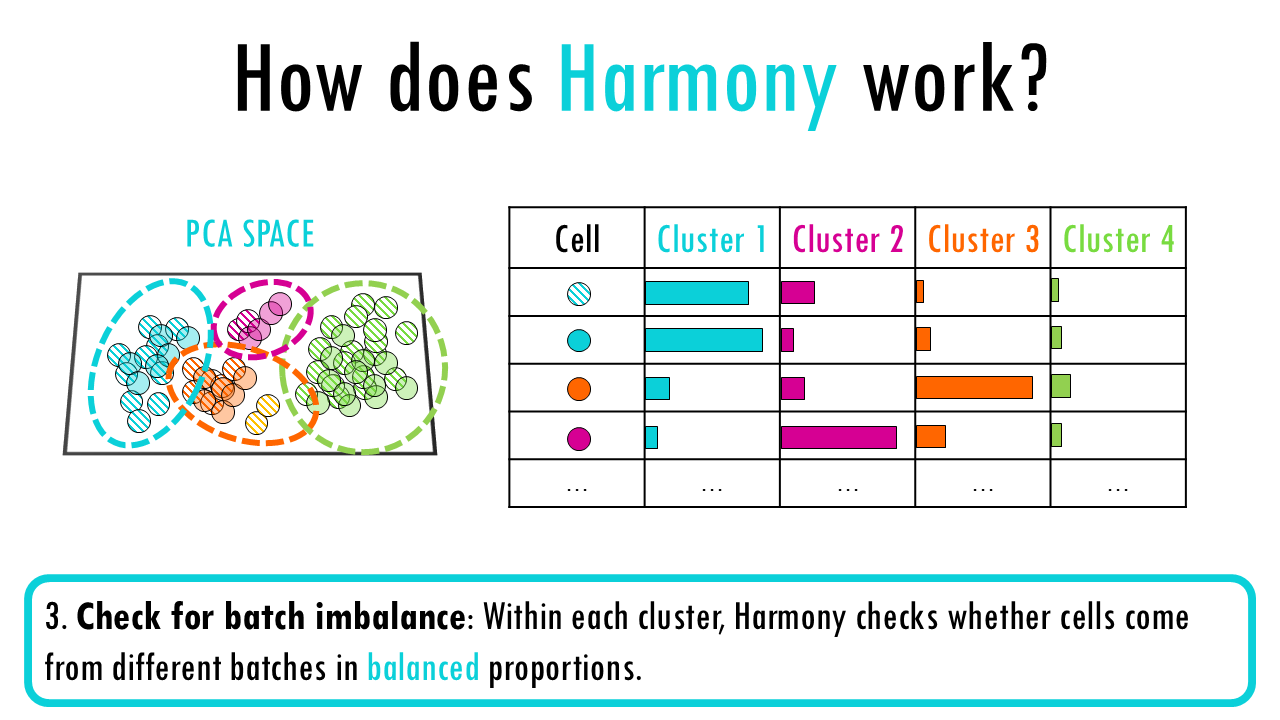 3. Check for batch imbalance: Within each cluster, Harmony checks whether cells come from different batches in balanced proportions.