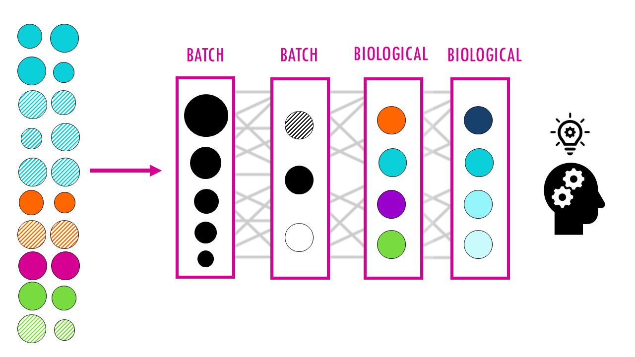 In essence, these methods create a latent space: a compact, hidden representation of each cell. Part of this space captures real biological differences (like cell type) and another part captures batch effects (technical artifacts). The model learns how to separate these sources of variation. Once learned, you can “subtract” the batch part and keep only the biology.